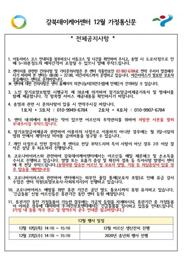 2020년 12월 강북데이케어센터 가정통신문입니다.