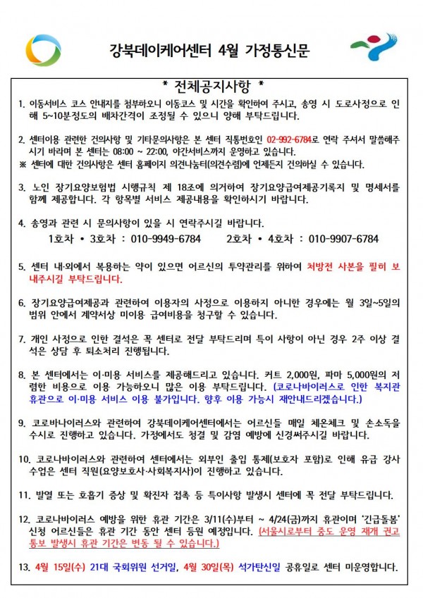 강북데이케어센터의 2020년 4월 가정통신문입니다