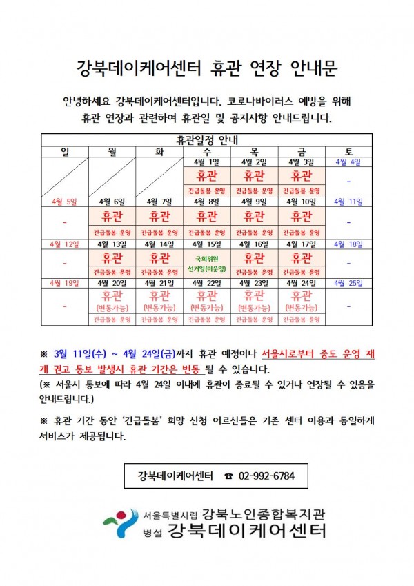 휴관일 : 3월 11일(수) ~ 4월 24일(금)