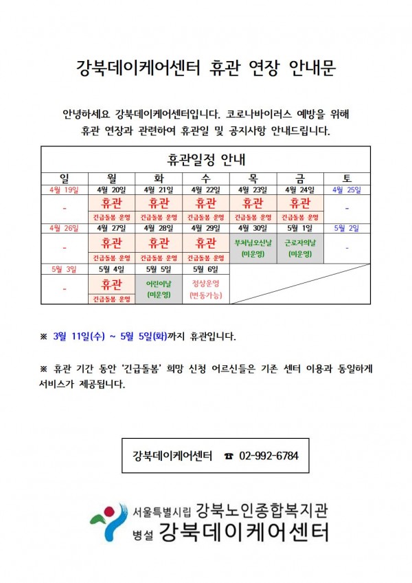 아래와 같이 휴관일이 연장되었으니 참고바랍니다.